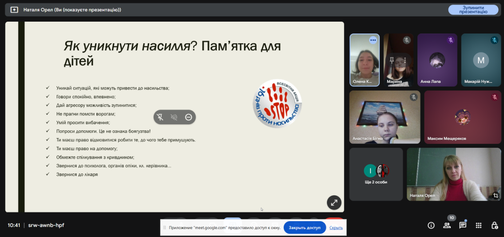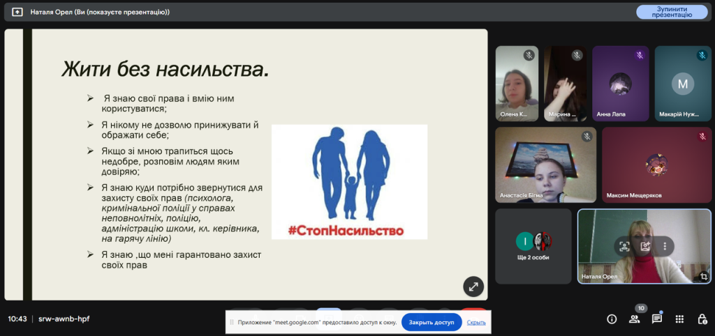 Основною метою заходу було привернення уваги здобувачів освіти до проблеми насильства та формування у них усвідомлення неприйнятності будь-яких його проявів. Під час заходу учні опрацьовували кейси — короткі ситуації, де потрібно визначити вид насильства та запропонувати шляхи реагування, обговорили правові аспекти: гарячі лінії, служби підтримки та права неповнолітніх.